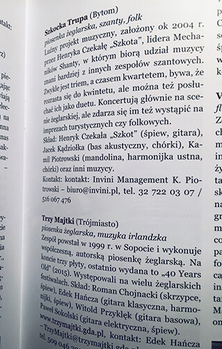 Mamy już sporo materiałów w tematach „Wykonawcy” i „Wydawnictwa” (jak wspomnieliśmy, opisujemy tę scenę od dekad). Lecz jeśli masz zdjęcia, notatki, skany artykułów, relacje, linki do archiwalnych filmów (lub filmy na kasetach video) śpiewniki żeglarskie – nawet te kserowane w małych nakładach, ale poświęcone jakiemuś wydarzeniu; broszury, gazety szantowe, kopie/zdjęcia plakatów itp., wiedzę o kimś, lub o czymś, co twoim zdaniem powinno się w encyklopedii znaleźć napisz do nas… przyślij propozycję, opis tego co masz. Każda informacja może się przydać.